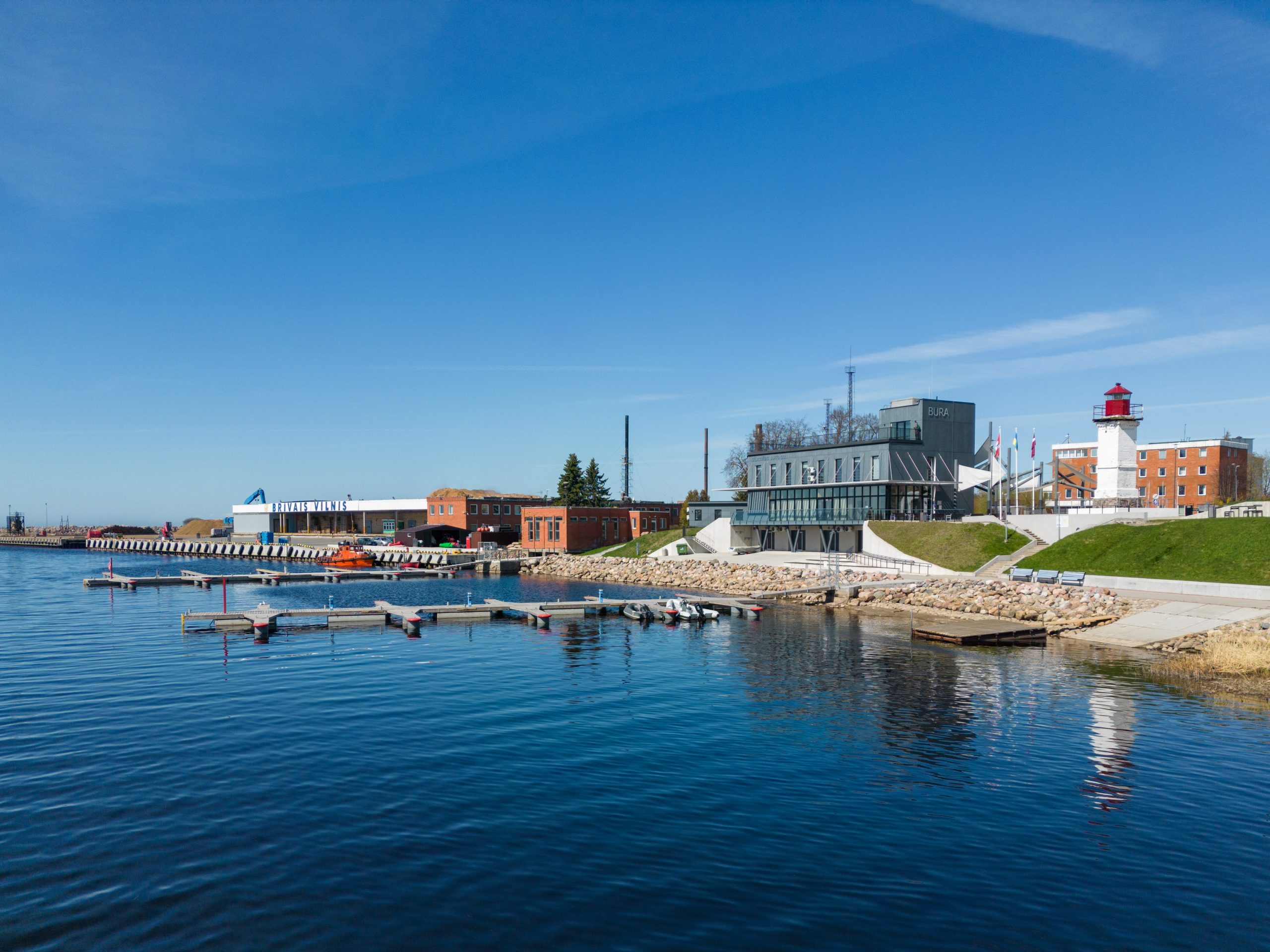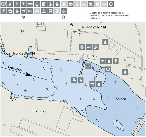 Ostā ir ir divas peldošās piestātnes ar tauvošanas pirkstiem, tauvošanās bojām, 40 jahtu vietām. Pie jahtu piestātnes var pienākt jahtas ar iegrimēm līdz 2,3 m.